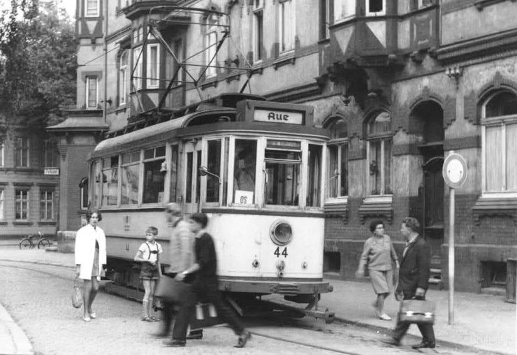 Rainerles alte Heimat Mühlhausen / Thüringen Straßenbahn TW 44 Unterstadtlinie Augustastraße Richtung Aue ca.1965 Quelle: Facebook Staßenbahnfreunde